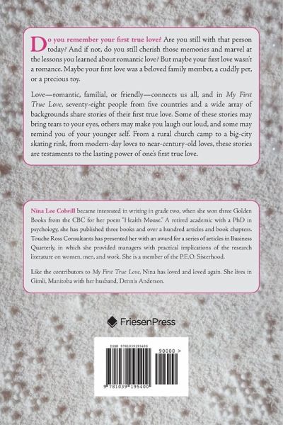 Do you remember your first true love? Are you still with that person today? And if not, do you still cherish those memories and marvel at the lessons you learned about romantic love? But maybe your first love wasn't a romance. Maybe your first love was a beloved family member, a cuddly pet, or a precious toy. Love-romantic, familial, or friendly-connects us all, and in My First True Love, seventy- eight people from five countries and a wide array of backgrounds share stories of their first true love. Some of these stories may bring tears to your eyes, others may make you laugh out loud, and some may remind you of your younger self. From a rural church camp to a big-city skating rink, from modern-day loves to near-century-old loves, these stories are testaments to the lasting power of one's first true love.
