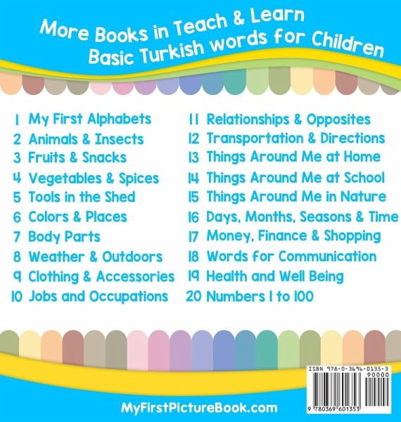 Did you ever want to teach your kids the basics of Turkish ? Learning Turkish can be fun with this picture book. In this book you will find the following features: Turkish Alphabets Turkish Words English Translations Some Important Information Regarding Our Books: Each Alphabet has its own Page. All Pages are in Color. No Transliterations (Pronunciations). You (the Parent) should be helping your child learn how to pronounce.