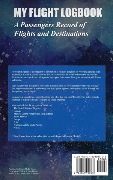 My Flight Logbook is a perfect travel companion. It includes a register for recording detailed flight information as well as current maps so that you can color in the states and countries as you visit. There is also a section for recording notes about your destination. Share your memories with friends and family. Each log entry has a column to write your memories or to let crew members write you a message. The pages contain totals at the bottom, just like a pilots logbook, to keep track of the distance and time you've been in the air. Included is a separate log to record airports and cities that you have flown to. This makes a handy reference of airport codes and locations for future reference. Maps are included for each part of the world: The United States of America, Canada, Mexico, Central America and the Caribbean, South America, Europe, Asia, Australia and the South Pacific, and Africa.