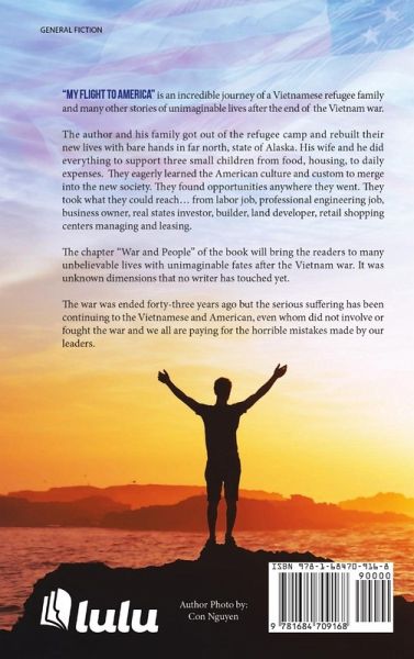 "My Flight To America" is an incredible journey of a Vietnamese refugee family and many other stories of unimaginable lives after the end of the Vietnam War. The author and his family got out of the refugee camp and rebuilt their new lives with bare hands in far north, state of Alaska. His wife and he did everything to support three small children from food, housing, to daily expenses. They eagerly learned the American culture and custom to merge into the new society. They found opportunities anywhere they went. They took what they could reach... from labor job, professional engineering job, business owner, real states investor, builder, land developer, retail shopping centers managing and leasing. The chapter "War and People" of the book will bring the readers to many unbelievable lives with unimaginable fates after the Vietnam War. It was unknown dimensions that no writer has touched yet.
