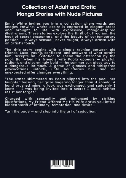 Emily White invites you into a collection where words and images entwine, where desire is captured in elegant prose and brought to life with expressive, manga-inspired illustrations. These stories explore the thrill of attraction, the heat of secret encounters, and the beauty of contemporary passion - always sensual, never vulgar, always drawn with an artist's touch.The title story begins with a simple reunion between old friends. Luca, young, confident, and unaware of what awaits him, accepts an invitation to spend the afternoon by the pool. But when his friend's wife Paola appears - playful, radiant, and disarmingly bold - the summer sun gives way to a dangerous intimacy. A game of glances and whispered provocations unfolds, until boundaries blur and an unexpected offer changes everything."The water shimmered as Paola slipped into the pool, her laughter teasing, her gaze lingering longer than it should. A hand brushed mine, a look was exchanged, and suddenly I knew - I was being invited into a secret I could neither resist nor forget."Charged with sensuality and enhanced by striking illustrations, My Friend Offered Me His Wife draws you into a hidden world of intimacy, temptation, and desire.Turn the page - and step into the art of seduction.