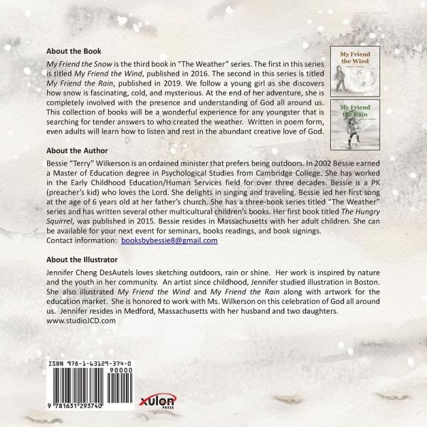About the BookMy Friend the Snow is the third book in this series. The first book in this series is titled My Friend the Wind published in 2016. The second book in this series is titled My Friend the Rain published in 2019. We follow a young girl as she discovers how snow is fascinating, cold and mysterious. By the end of the story, she is completely involved with the presence and understanding of God all around us. This collection of books will be a wonderful experience for any youngster that is searching for tender answers to who created the weather. Written in poem form, even adults will learn how to listen and rest in the abundant creative love of God. About the AuthorBessie "Terry" Wilkerson is an ordained minister that prefers being outdoors. In 2002 Bessie earned a Master of Education degree in Psychological Studies from Cambridge College. She has worked in the Early Childhood Education/Human Services field for over three decades. Bessie is a PK (preacher's kid) and loves the Lord. She is pleased greatly in singing, travel, and writing children's books. Bessie can be available at your next event for seminars, book readings, and book signings. Bessie resides in Massachusetts, with her adult children.Contact information: booksbybessie8@gmail.comAbout the IllustratorJennifer Cheng DesAutels loves sketching outdoors, rain or shine. Her work is inspired by nature and the youth in her community. An artist since childhood, Jennifer studied illustration in Boston. She also illustrated My Friend the Wind and My Friend the Rain along with artwork for the education market. She is honored to work with Ms. Wilkerson on this celebration of God all around us. Jennifer resides in Medford, Massachusetts with her husband and two daughters.www.studioJCD.com