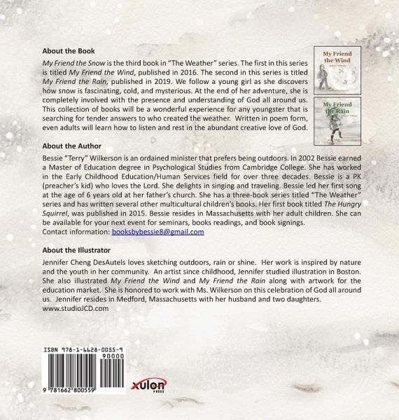 About the BookMy Friend the Snow is the third book in this series. The first book in this series is titled My Friend the Wind published in 2016. The second book in this series is titled My Friend the Rain published in 2019. We follow a young girl as she discovers how snow is fascinating, cold and mysterious. By the end of the story, she is completely involved with the presence and understanding of God all around us. This collection of books will be a wonderful experience for any youngster that is searching for tender answers to who created the weather. Written in poem form, even adults will learn how to listen and rest in the abundant creative love of God. About the AuthorBessie "Terry" Wilkerson is an ordained minister that prefers being outdoors. In 2002 Bessie earned a Master of Education degree in Psychological Studies from Cambridge College. She has worked in the Early Childhood Education/Human Services field for over three decades. Bessie is a PK (preacher's kid) and loves the Lord. She is pleased greatly in singing, travel, and writing children's books. Bessie can be available at your next event for seminars, book readings, and book signings. Bessie resides in Massachusetts, with her adult children.Contact information: booksbybessie8@gmail.comAbout the IllustratorJennifer Cheng DesAutels loves sketching outdoors, rain or shine. Her work is inspired by nature and the youth in her community. An artist since childhood, Jennifer studied illustration in Boston. She also illustrated My Friend the Wind and My Friend the Rain along with artwork for the education market. She is honored to work with Ms. Wilkerson on this celebration of God all around us. Jennifer resides in Medford, Massachusetts with her husband and two daughters.www.studioJCD.com