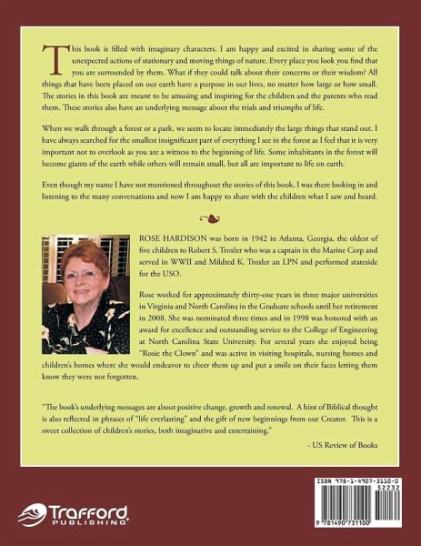 This book is filled with imaginary characters. I am happy and excited in sharing some of the unexpected actions of stationary and moving things of nature. Every place you look you find that you are surrounded by them. What if they could talk about their concerns or their wisdom? All things that have been placed on our earth have a purpose in our lives, no matter how large or how small. The stories in this book are meant to be amusing and inspiring for the children and the parents who read them. These stories also have an underlying message about the trials and triumphs of life. When we walk through a forest or a park, we seem to locate immediately the large things that stand out. I have always searched for the smallest insignificant part of everything I see in the forest as I feel that it is very important not to overlook as you are a witness to the beginning of life. Some inhabitants in the forest will become giants of the earth while others will remain small, but all are important to life on earth. Even though my name I have not mentioned throughout the stories of this book, I was there looking in and listening to the many conversations and now I am happy to share with the children what I saw and heard.