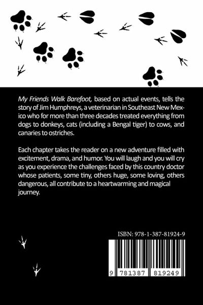 My Friends Walk Barefoot, based on actual events, tells the story of Jim Humphreys, a veterinarian in Southeast New Mexico who for more than three decades treated everything from dogs to donkeys, cats (including a Bengal tiger) to cows, and canaries to ostriches. Each chapter takes the reader on a new adventure filled with excitement, drama, and humor. You will laugh and you will cry as you experience the challenges faced by this country doctor whose patients, some tiny, others huge, some loving, others dangerous, all contribute to a heartwarming and magical journey.