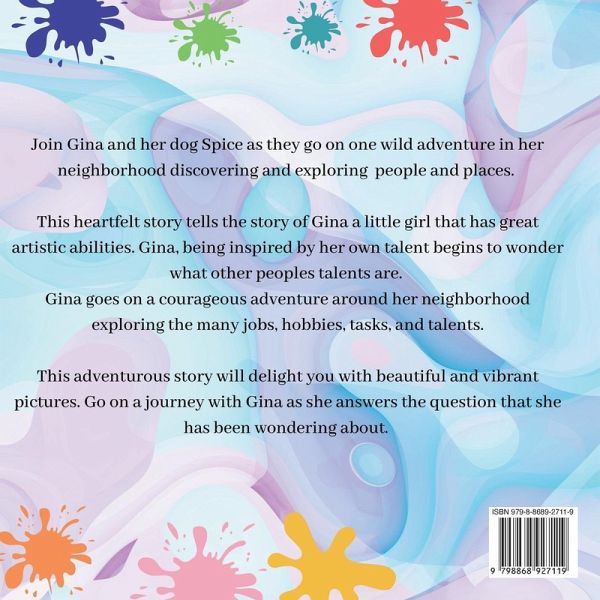 Gina and her dog Spice go on one fun adventure in her neighborhood discovering and exploring people and places. This action adventure story tells the story of Gina a little girl that has great painting abilities. Gina, being inspired by her own skills begins to wonder what other peoples talents are in the world. Gina goes on a fun and exciting adventure around her neighborhood exploring the many jobs, hobbies, tasks, and talents that her neighbors have. This exciting story will delight you with beautiful and vibrant pictures.