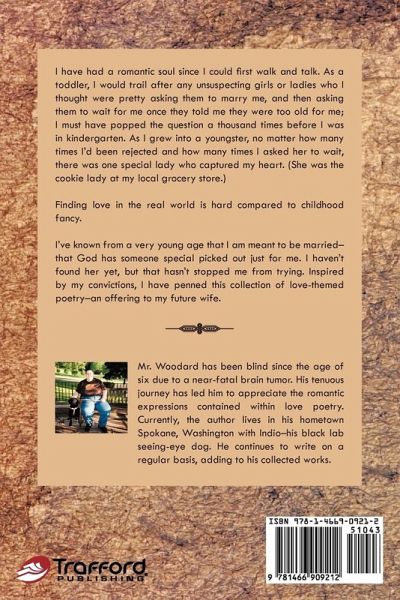 I have had a romantic soul since I could fi rst walk and talk. As a toddler, I would trail after any unsuspecting girls or ladies who I thought were pretty asking them to marry me, and then asking them to wait for me once they told me they were too old for me; I must have popped the question a thousand times before I was in kindergarten. As I grew into a youngster, no matter how many times I'd been rejected and how many times I asked her to wait, there was one special lady who captured my heart. (She was the cookie lady at my local grocery store.) Finding love in the real world is hard compared to childhood fancy. I've known from a very young age that I am meant to be married- that God has someone special picked out just for me. I haven't found her yet, but that hasn't stopped me from trying. Inspired by my convictions, I have penned this collection of love-themed poetry-an offering to my future wife.