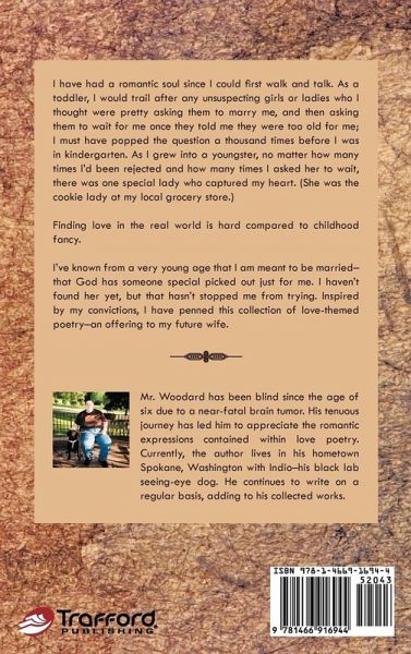 I have had a romantic soul since I could fi rst walk and talk. As a toddler, I would trail after any unsuspecting girls or ladies who I thought were pretty asking them to marry me, and then asking them to wait for me once they told me they were too old for me; I must have popped the question a thousand times before I was in kindergarten. As I grew into a youngster, no matter how many times I'd been rejected and how many times I asked her to wait, there was one special lady who captured my heart. (She was the cookie lady at my local grocery store.) Finding love in the real world is hard compared to childhood fancy. I've known from a very young age that I am meant to be married- that God has someone special picked out just for me. I haven't found her yet, but that hasn't stopped me from trying. Inspired by my convictions, I have penned this collection of love-themed poetry-an offering to my future wife.