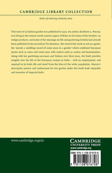 This story of an Indian garden was published in 1915. Its author, Kathleen L. Murray, was living in the remote north-eastern region of Bihar in the home of her brother, an indigo producer, and some of her musings on life and gardening in India had already been published in the periodical The Statesman. She viewed this work not as a guide, but 'merely a rambling record of some years in a garden' which combined European plants such as roses and sweet peas with natives such as cannas and beaumontias. Along with her gardening successes and failures over three years, the book provides insights into the life of the European woman in India - with no employment, and required to be both idle and aloof from the lives of the wider population. Murray's descriptive powers and enthusiasm for her garden make this book both enjoyable and evocative of imperial India.