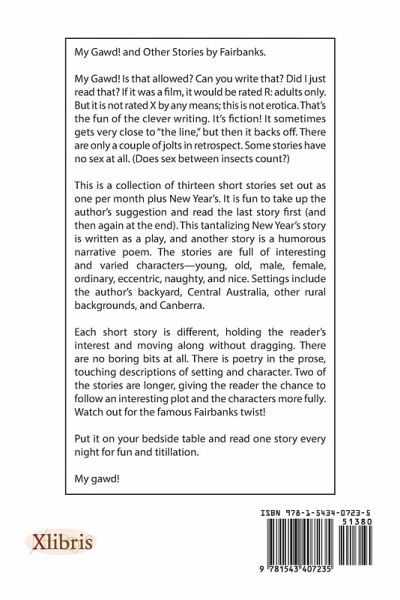 My Gawd! and Other Stories by Fairbanksjust the one word, like Moses, like Prince. My Gawd! Is that allowed? Can you write that? If it was a film, it would be rated R: adults only. But not rated X by any means; this is not erotica. Thats the fun of the clever writing. Its fiction! It sometimes gets very close to the line, but then it backs off. There are only a couple of jolts in retrospect. Some stories have no sex at all. (Does sex between insects count?) This is a collection of thirteen short stories set out as one per month plus New Years. It is fun to take up the authors suggestion and read the last story first (and then again at the end). This tantalizing New Years story is written as a play, and the other one is a humorous narrative poem. The stories are full of interesting and varied charactersyoung, old, male, female, ordinary, eccentric, naughty, and nice. Settings include the authors backyard, Central Australia, other rural backgrounds, and Canberra. Each short story is different, holding the readers interest and moving along without dragging. There are no boring bits at all. There is poetry in the prose, touching descriptions of setting and character. Two of the stories are longer, giving the reader the chance to follow an interesting plot and the characters more fully. Watch out for the famous Fairbanks twist! Lots of marketing potential with this one! Put it on your bedside table and read one story a night for fun and for titillation. The next Fifty Shades? The naughty outback Aussies version. My gawd!