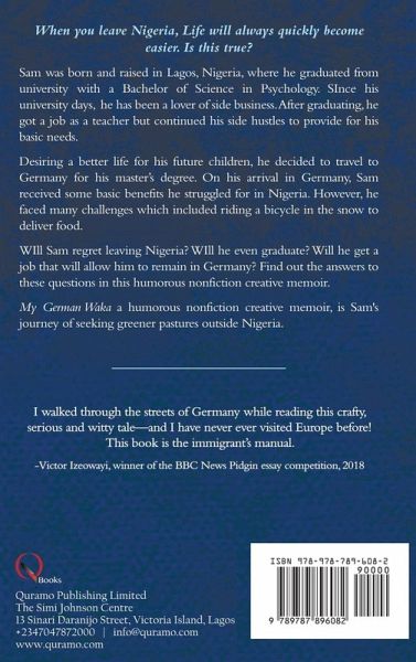 When you leave Nigeria, Life will always quickly become easier. Is this true? Sam was born and raised in Lagos, Nigeria, where he graduated from university with a Bachelor of Science in Psychology. Since his university days, he has been a lover of side business. After graduating, he got a job as a teacher but continued his side hustles to provide for his basic needs. Desiring a better life for his future children, he decided to travel to Germany for his master's degree. On his arrival in Germany, Sam received some basic benefits he struggled for in Nigeria. However, he faced many challenges which included riding a bicycle in the snow to deliver food. Will Sam regret leaving Nigeria? Will he even graduate? Will he get a job that will allow him to remain in Germany? Find out the answers to these questions in this humorous nonfiction creative memoir. My German Waka a humorous nonfiction creative memoir, is Sam's journey of seeking greener pastures outside Nigeria. I walked through the streets of Germany while reading this crafty, serious and witty tale-and I have never ever visited Europe before! This book is the immigrant's manual. - Victor Izeowayi, winner of the BBC News Pidgin essay competition, 2018