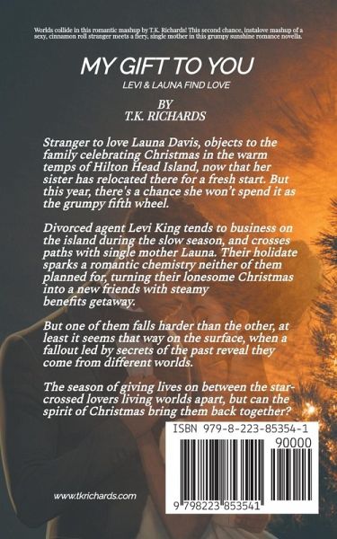 Worlds collide in this romantic mashup by T.K. Richards! This second chance, instalove mashup of a sexy, cinnamon roll stranger meets a fiery, single mother delivers the holiday feels with a cute meet cute, and zero fade to black scenes where it is all laid out under the mistletoe for a grumpy sunshine romance. Guess Who's Coming To Dinner... Stranger to love Launa Davis, objects to the family celebrating Christmas in the warm temps of Hilton Head Island, now that her sister has relocated there for a fresh start. But this year, there's a chance she won't spend it as the grumpy fifth wheel. Divorced agent Levi King tends to business on the island during the slow season, and crosses paths with single mother Launa. Their holidate sparks a romantic chemistry neither of them planned for, turning their lonesome Christmas into a new friends with steamy benefits getaway. But one of them falls harder than the other, at least it seems that way on the surface, when a fallout led by secrets of the past reveal they come from different worlds. The season of giving lives on between the star-crossed lovers living worlds apart, but can the spirit of Christmas bring them back together?
