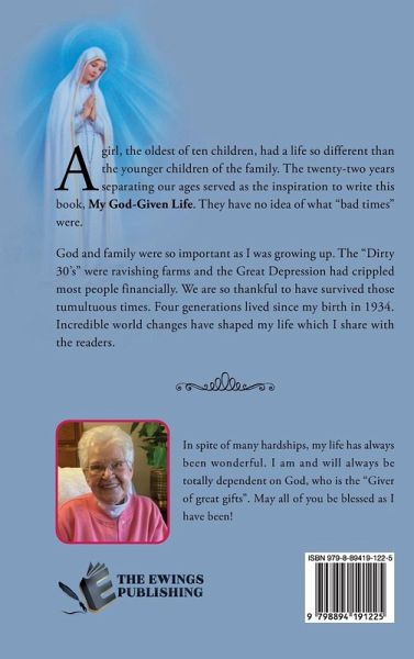 A girl, the oldest of ten children, had a life so different than the younger children of the family. The twenty-two years separating our ages served as the inspiration to write this book, My God-Given Life. They have no idea of what "bad times" were. God and family were so important as I was growing up. The "Dirty 30's" were ravishing farms and the Great Depression had crippled most people financially. We are so thankful to have survived those tumultuous times. Four generations lived since my birth in 1934. Incredible world changes have shaped my life which I share with the readers.