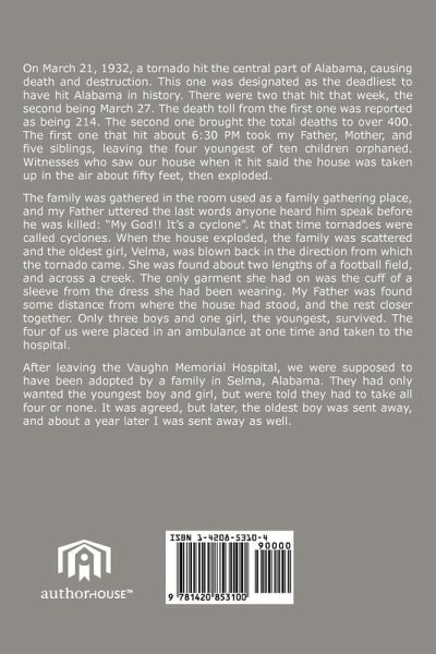 On March 21, 1932, a tornado hit the central part of Alabama, causing death and destruction. This one was designated as the deadliest to have hit Alabama in history. There were two that hit that week, the second being March 27. The death toll from the first one was reported as being 214. The second one brought the total deaths to over 400. The first one that hit about 6:30 PM took my Father, Mother, and five siblings, leaving the four youngest of ten children orphaned. Witnesses who saw our house when it hit said the house was taken up in the air about fifty feet, then exploded. The family was gathered in the room used as a family gathering place, and my Father uttered the last words anyone heard him speak before he was killed: "My God!! It's a cyclone". At that time tornadoes were called cyclones. When the house exploded, the family was scattered and the youngest girl, Velma, was blown back in the direction from which the tornado came. She was found about two lengths of a football field, and across a creek. The only garment she had on was the cuff of a sleeve from the dress she had been wearing. My Father was found some distance from where the house had stood, and the rest closer together. Only three boys and one girl, the youngest, survived. The four of us were placed in an ambulance at one time and taken to the hospital. After leaving the Vaughn Memorial Hospital, we were supposed to have been adopted by a family in Selma, Alabama. They had only wanted the youngest boy and girl, but were told they had to take all four or none. It was agreed, but later, the oldest boy was sent away, and about a year later I was sent away as well.