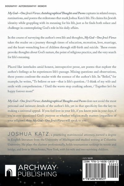 My God--One Jew's Views: Autobiographical Thoughts and Poems captures in related essays, ruminations, and poems the milestones that mark Joshua Katz's life. He claims his Jewish identity while grappling with its meaning for his life, just as he finds both solace and challenge in contemplating God's role in his daily affairs. In the course of surveying the author's own life and thoughts, My God--One Jew's Views takes the reader on a journey through times of education, recreation, love, marriage, and the heart-wrenching loss of children through still-birth and suicide. These events provoke thoughts about God's nature, the point of religious practice, and the very search for life's meaning. Placed like interludes amid honest, introspective prose, are poems that explore the author's feelings as he experiences life's passage. Mixing questions and observations, these poems confront the reader with the essence of the author's life. In "Belief," for example, he writes, "To believe or not--that is life's question. / I think of my wife and smile with comprehension. / Until the waves stop crashing ashore, / Together let's be happy forever more!" Mem>My God--One Jew's Views: Autobiographical Thoughts and Poems does not avoid the most personal and intimate details of the author's life, yet in that specificity lies the key to making a universal appeal. If you feel love in your life, if you know pain in your days, if you've ever questioned God's purpose or whether religion really matters (regardless of your religion), then My God--One Jew's Views will speak to you.