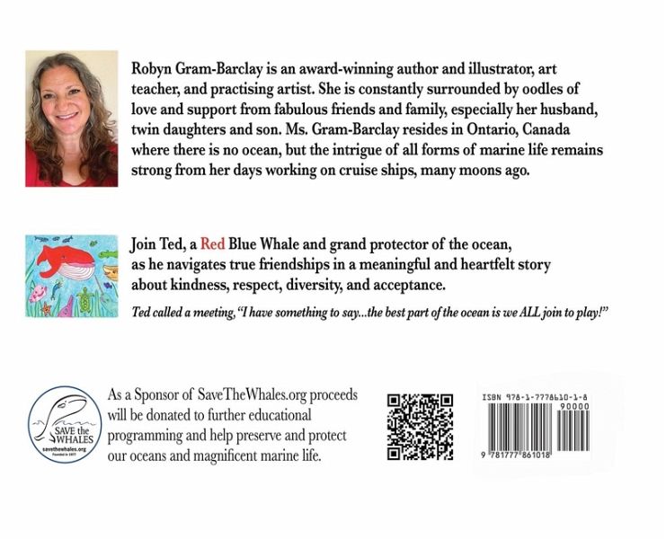 Robyn Gram-Barclay is an art teacher, a practicing artist and an award-winning author and illustrator. The 'My Good Friend, Ted!' picture book series was inspired by her son's affinity for sea creatures since he was a toddler. Written as a fun poem over the pandemic, Gram-Barclay workshopped the text of "My Good Friend, Ted!" with her students and once given the seal of approval, moved full speed ahead with the illustrations. During the following two years, two more books in the series, 'The Ocean of Colour' and Ted's Tale of the Tangled-Up Whale' were published. The 'Ted' series shares significant themes that children should take to heart including kindness, respect, diversity, acceptance, inclusion, and the importance of teamwork. Written in rhyme and illustrated in vibrant watercolour, each book will engage, enlighten and educate readers about spectacular sea creatures as well as caring for our oceans. Robyn Gram-Barclay is a Sponsor for the world renowned organization Save The Whales to which a portion of the proceeds are donated to help support educational programming and preserve and protect our global waters and magnificent marine life. Robyn Gram-Barclay resides in Bolton, Ontario, Canada with her husband, twin daughters, son, a cat, snake, and fish!