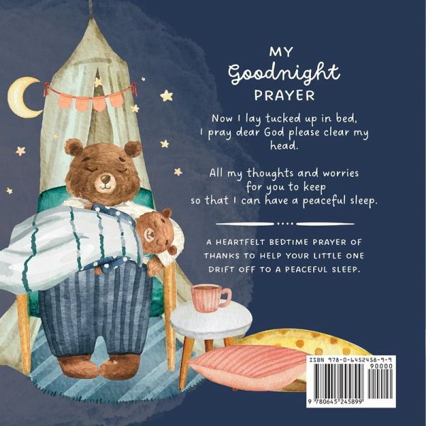 Now I lay tucked up in bed, I pray dear God please clear my head. All my thoughts and worries for you to keep so that I can have a peaceful sleep. My Goodnight Prayer is an inspiring and meaningful bedtime prayer for parents and children alike. The prayer's calming, poetic language gives children the words they need to express their thanks to God for all the blessings they have experienced throughout the day. With the help of this special prayer, children can drift off to a peaceful sleep, feeling safe and secure in the knowledge that God is listening to their prayers and keeping them in his loving embrace. With its simple and comforting message, and soothing illustrations this book is sure to become the perfect way to end each day for your little one.