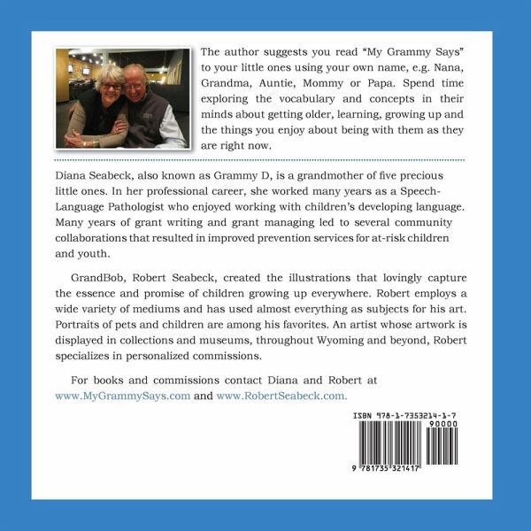 Diana Seabeck (1947) was raised in Oklahoma, Texas, New Mexico and Arizona. She attended five elementary schools and eventually put down roots in Wyoming. Diana married an artist, Robert, raised two sons and has lived there for 47 years. She enjoys wearing many 'hats' in her private life and seldom lacks for something stimulating and fulfilling to do. Also known as Grammy D, Diana especially enjoys wearing the grandmother hat with two granddaughters and three grandsons. In her professional life Diana worked in public school with children and parents as a Speech-Language Pathologist and was particularly interested in children's developing language and vocabulary. She left the work-world of writing and implementing Individual Educational Plans with students and spent over ten years writing federal and state grants and managing them with a team of five employees. This led to several community collaborations that resulted in improved prevention services for at-risk children and youth in her community. After returning to her real career, Diana had the privilege of working with students 12-15 years old and ultimately with graduate students at the University of Wyoming. There she supervised their Masters' level clinical practice in Speech-Language Pathology along with three special colleagues. Robert also treasures his time being Grand Bob. An accomplished artist, he frequently draws the grandchildren. Robert created the watercolor images that capture the essence of growing children in My Grammy Says I Can't Grow Up!