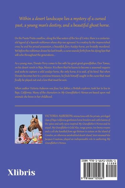 Within a desert landscape lies a mystery of a cursed past, a young man's destiny, and a beautiful ghost horse. On the Punta Prieta coastline, along the blue waters of the Sea of Cortez, there is a centuries-old legend of a Spanish nobleman whose ship ran aground. In a mutiny by the impoverished crew, he and his prized possession, a beautiful, fiery Azulejo horse, are brutally murdered. Yet before the nobleman draws his last breath, a curse sounds forth from his dying lips that will echo throughout the generations... As a young man, Donato Perry comes to live with his great-great-grandfather, Don Tomas, on his desert ranch in Baja, Mexico. It is there that he learns to become a seasoned vaquero and seeks to capture a wild azulejo horse, the only horse, it is said, of its kind. But when Donato becomes heir to a precious treasure, he finds himself caught in the curse that must finally be played out and a love that must be won. When author Victoria Auberon was four, her father, a British explorer, took her to live in Baja, California. Many of the characters in My Grandfather's Horses are based upon real animals she knew in her childhood. From age thirteen to fifteen, Victoria spent three years handling horses on the uninhabited island of Cerralvo, in the Sea of Cortez. As an adult, Victoria has managed horse farms in several states as well as having owned, bred, and trained her own Arabian Horses in the USA.