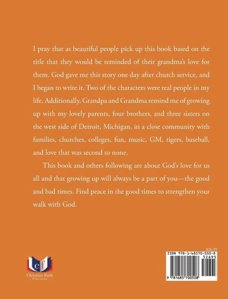 I pray that as beautiful people pick up this book based on the title that they would be reminded of their grandma's love for them. God gave me this story one day after church service, and I began to write it. Two of the characters were real people in my life. Additionally, Grandpa and Grandma remind me of growing up with my lovely parents, four brothers, and three sisters on the west side of Detroit, Michigan, in a close community with families, churches, colleges, fun, music, GM, tigers, baseball, and love that was second to none. This book and others following are about God's love for us all and that growing up will always be a part of you--the good and bad times. Find peace in the good times to strengthen your walk with God.