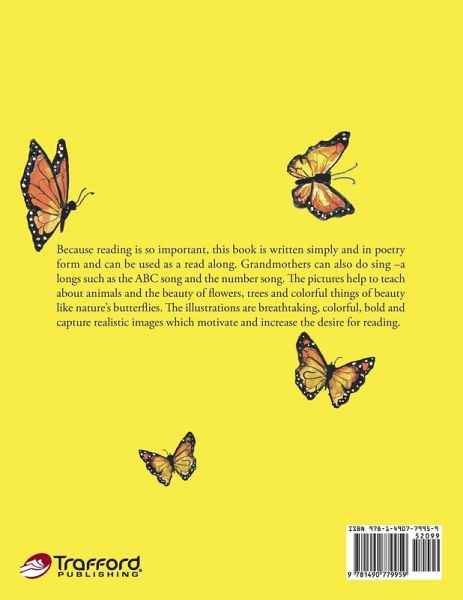 Because reading is so important, this book is written simply and in poetry form and can be used as a read along. Grandmothers can also do sing –a longs such as the ABC song and the number song. The pictures help to teach about animals and the beauty of flowers, trees and colorful things of beauty like nature’s butterflies. The illustrations are breathtaking, colorful, bold and capture realistic images which motivate and increase the desire for reading.