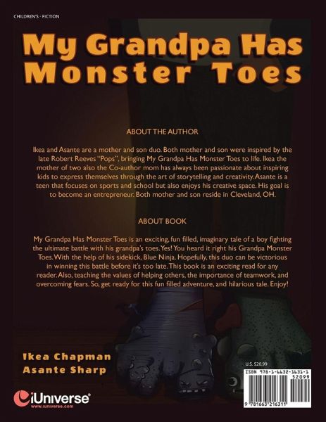 My Grandpa Has Monster Toes is an exciting, fun filled, imaginary tale of a boy fighting the ultimate battle with his grandpa's toes. Yes! You heard it right his Grandpa Monster Toes. With the help of his sidekick, Blue Ninja. Hopefully, this duo can be victorious in winning this battle before it's too late. This book is an exciting read for any reader. Also, teaching the values of helping others, the importance of teamwork, and overcoming fears. So, get ready for this fun filled adventure, and hilarious tale. Enjoy!