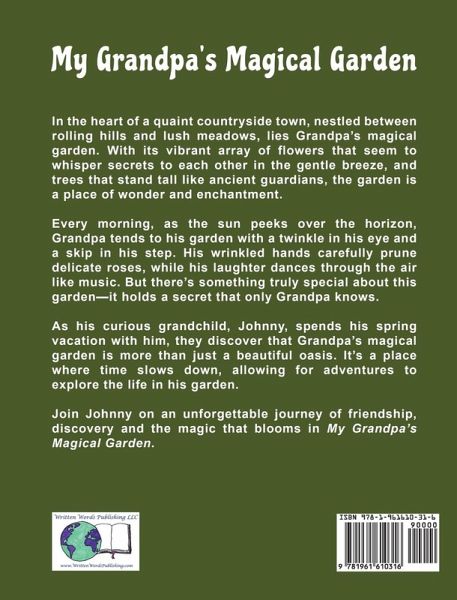 In the heart of a quaint countryside town, nestled between rolling hills and lush meadows, lies Grandpa's magical garden. With its vibrant array of flowers that seem to whisper secrets to each other in the gentle breeze, and trees that stand tall like ancient guardians, the garden is a place of wonder and enchantment. Every morning, as the sun peeks over the horizon, Grandpa tends to his garden with a twinkle in his eye and a skip in his step. His wrinkled hands carefully prune delicate roses, while his laughter dances through the air like music. But there's something truly special about this garden-it holds a secret that only Grandpa knows. As his curious grandchild, Johnny, spends his spring vacation with him, they discover that Grandpa's magical garden is more than just a beautiful oasis. It's a place where time slows down, allowing for adventures to explore the life in his garden. Join Johnny on an unforgettable journey of friendship, discovery and the magic that blooms in My Grandpa's Magical Garden.