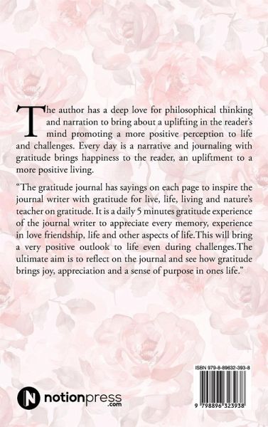 "The gratitude journal has sayings on each page to inspire the journal writer with gratitude for live, life, living and nature's teacher on gratitude. It is a daily 5 minutes gratitude experience of the journal writer to appreciate every memory, experience in love friendship, life and other aspects of life. This will bring a very positive outlook to life even during challenges. The ultimate aim is to reflect on the journal and see how gratitude brings joy, appreciation and a sense of purpose in ones life