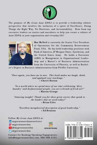 My Great Aunt EDNA is a leadership platform that stands for Excellence, Doing Things the Right Way, No Shortcuts, & Accountability. Mac McNeil discusses metaphorical and anecdotal stories from his own leadership and life journey with organizations such as JPMorgan Chase, Bank of America, Synchrony, and The Community Reinvestment Fund, USA, as well as the inclusion of wisdom nugget contributions from several other top leaders! Mac McNeil has been a leader in the financial industry for seventeen years in various leadership roles. He is currently the Senior Vice President of Operations for the Community Reinvestment Fund, USA where he leads Enterprise Operations which includes Asset Management, Customer Engagement, Data Management & Analytics, Fund Administration, Learning & Development, Loan Servicing Operations, Process Governance, Risk & Controls, Technology/Automation, Underwriting & Closing, and Vendor Relations. Mac is the author of My Great Aunt EDNA book and weekly newsletter that highlights the leadership topics of Excellence, Doing Things the Right Way, No Shortcuts, and Accountability.He began his career with JPMorgan Chase in Branch Banking, and spent four years as a 1st Vice President, District Manager in Southern California. He finished in the top 5% of performance in the country and was recognized two consecutive years as a Top Performing District Manager. He accepted a role with Bank of America as a Vice President, Consumer Market Manager in the Los Angeles East Market in 2014. He accepted a position of Vice President, Operations Market Manager, where he managed over 100 financial centers and finished 2015 #2 in performance in the country and was recognized as Pinnacle Club Performer top 1%. Mac became Vice President of Operations Optimization for Synchrony where he was responsible for leading optimization initiatives for the Consumer Bank to include robotic process automation, digital transformation, process mapping, and product development with operations in Charlotte, NC, Merriam, KS, Hyderabad, India, and Manila, Philippines. Mac has a Bachelor's degree in Business Administration from Pfeiffer University, a Master's degree in Business Administration from the University of Phoenix, and Doctorate (ABD) in Management and Organizational Leadership from the University of Phoenix.Mac spent four years in the U.S. Army as an Intelligence Analyst in Psychological Operations, Special Operations Command (Airborne), and he is a Desert Storm Veteran. He has served on the Board of Directors for Feeding America of Greater Riverside, Inspire Life Skills Training, Inc, The Christian Adoption Service, The Black Professional Group of Bank of America, and The Black Organization for Leadership Development for JPMorgan Chase.