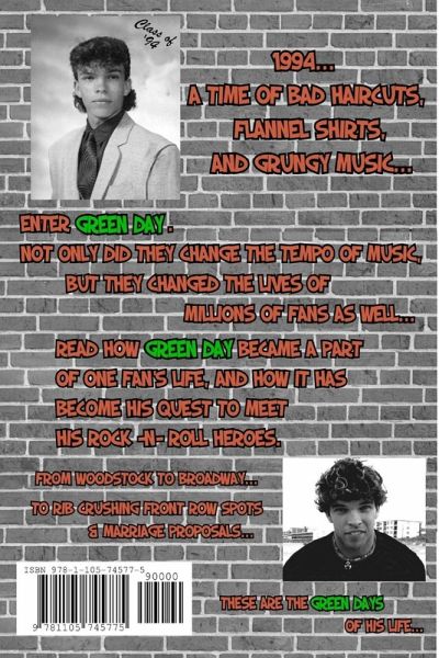 1994-A time of bad haircuts, flannel shirts, and grungy music. Enter Green Day. Not only did they change the tempo of music, but they changed the lives of millions of fans as well. Read how Green Day became a part of one fan's life, and how it has become his quest to meet his Rock -n- Roll heroes. From Woodstock to Broadway... to rib-crushing front row spots & marriage proposals... These are the Green Days of his life...