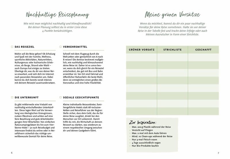 Das nachhaltige Reisetagebuch mit Eintrageseiten, praktischen Listen, grünen Tipps, Öko-Trackern und emotional gestalteten MoodseitenNachhaltig reisen statt Verzicht: diese hilfreichen Fakten und Impulse verhelfen zu einem fairen, umweltverträglichen und intensiven UrlaubserlebnisMotivierend und inspirierend: Zitate zum Thema Natur und Umwelt spornen zu rücksichtsvollem Reisen und Verhalten in allen Ländern unserer schönen Welt anTolles Design trifft praktische Ausstattung: mit FSC-zertifiziertem Papier, Blindprägung, Gummiband und Lesebändchen