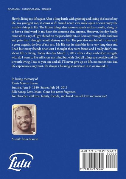 Slowly, living my life again After a long battle with grieving and losing the love of my life, my youngest son, it seems as if I would never, ever smile again or even enjoy the smallest things in life. The littlest things that mean so much such as a smile, a hug, or to have a kind word in my heart for someone else, anyone. However, the day finally came when a ray of light shined on me just a little bit, so I can see through the darkness and pain that I thought would destroy my life. The part that was left of it after such a great tragedy, the loss of my son. My life was in shambles for a very long time and I had lost many friends or at least I thought they were friend and I really didn't care about life or living. Today with God all things are possible and life is worth living. I say to you one and all, I'll never give up on life, no matter how bad life experiences may hurt. It's always a blessing somewhere in it, or around it.