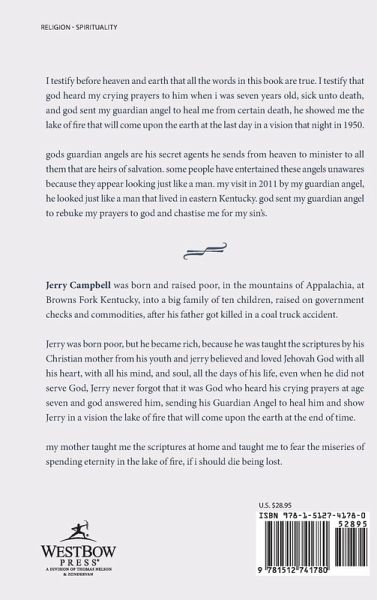 I testify before heaven and earth that all the words in this book are true. I testify that god heard my crying prayers to him when i was seven years old, sick unto death, and god sent my guardian angel to heal me from certain death, he showed me the lake of fire that will come upon the earth at the last day in a vision that night in 1950. gods guardian angels are his secret agents he sends from heaven to minister to all them that are heirs of salvation. some people have entertained these angels unawares because they appear looking just like a man. my visit in 2011 by my guardian angel, he looked just like a man that lived in eastern Kentucky. god sent my guardian angel to rebuke my prayers to god and chastise me for my sin's.