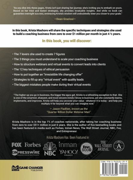In this book, Krista Mashore will share the specific techniques and strategies she used to build a coaching business from zero to over $1 million per month in just 4 ¿ years. In this book, you'll discover:The 7 Levers She Used To Create 7 Figures The 3 Things You Must Understand To Scale Your Coaching Business How To Structure Webinars and Virtual Events to Convert Leads Into Clients The 12 Key Techniques Of Ethical Persuasion How To Put Together An "Irresistible Life-Changing Offer" Strategies To Fill Up Any "Virtual Event" With Quality Leads The Biggest Mistakes People Make During Their Virtual Events