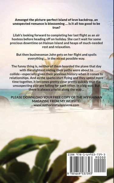 Amongst the picture-perfect island of love backdrop, an unexpected romance is blossoming ... is it all too good to be true? Lilah's looking forward to completing her last flight as an air hostess before heading off on holiday. She can't wait for some precious downtime on Hainan Island and heaps of much-needed rest and relaxation. But then businessman John gets on her flight and spoils everything ... in the nicest possible way. The funny thing is, neither of them boarded the plane that day with the slightest inkling their paths were about to collide-especially given their previous history when it comes to relationships. And as the sparks start flying and they spend more time together, it becomes pretty clear pretty quickly that the unsuspecting pair are falling for each other. In a big way. Then fate intervenes. Olivia, John's colleague, springs a surprise visit on him. Given her ulterior motive for joining him on the Island of Love, she is furious to see how taken he is with this air hostess. Lilah definitely did not feature in Olivia's plan! And so the trouble starts. Olivia continues to pursue John and is hellbent on bursting his bubble of love-even if it means destroying their careers. Are Lilah's feelings for John strong enough to put up with Olivia's poison? And how low will Olivia stoop to break up the happy couple? PLEASE DOWNLOAD YOUR FREE COPY OF THE MY HAINAN MAGAZINE FROM MY WEBSITE: www.authorstefanstevens.com