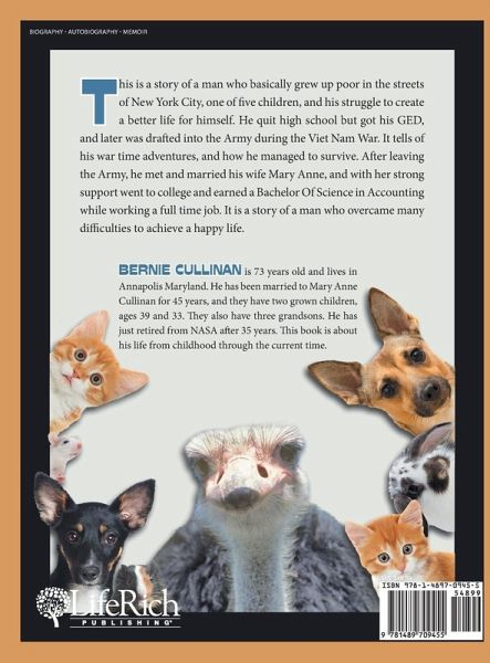 This is a story of a man who basically grew up poor in the streets of New York City, one of five children, and his struggle to create a better life for himself. He quit high school but got his GED, and later was drafted into the Army during the Viet Nam War. It tells of his war time adventures, and how he managed to survive. After leaving the Army, he met and married his wife Mary Anne, and with her strong support went to college and earned a Bachelor Of Science in Accounting while working a full time job. It is a story of a man who overcame many difficulties to achieve a happy life.