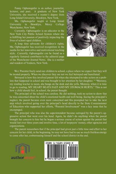If your child fell off his bicycle and broke his arm, what would you do? You might rush him to the nearest hospital emergency room where a physician will give him proper treatment. If your child came to you with an equally debilitating but emotional problem, what would you do? You would, no doubt, attempt to help him in anyway you could. We ( Parents) freely send our children to school, a place where we expect that they will be treated properly. When we discover they are not we feel betrayed and humiliated. Betrayed is how this involved parent felt when she attempted to take action on a problem that happened in school and was brought to her attention by her daughter. " "Mommy, my reading teacher is mean, she bangs on the desk and she yells. Mommy, when it is time to go to reading, MY HEART BEATS FAST AND MY STOMACH HURTS," This is not how a child should feel, in school, the parent thought. The principal of the school was careless. He did nothing, took no action to show that he was concerned about the child's emotional health and well-being. Seeing the principal's neglect, the parent became even more concerned and this prompted her to take the next step which involved going over the principal's head directly to the State Commissioner of Education who supported her efforts, "Parental Involvement" was a key issue that he encouraged. The principal who was also the superintendent became outraged by the parent's aggressive action that went over his head. Again, he didn't do anything when the parent brought her concern to him but he began a serious course of action against the parent that would last over three years and involve time, a lot of taxpayers' money, other agencies and organizations. The parent remembers that if the principal had given just a little time and effort to her concern for her child, in the beginning, he may not have had to use so much fruitless energy to come after her, embarrassing himself and the school district in the end.
