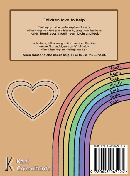 Children love to help. Written for 3-5 year olds, the Happy Helper series explores the way children help their family and friends by using what they have - hands, heart, eyes, mouth, ears, brain and feet. In this book, follow along as the reader realises that we are ALL special, even on MY birthday, by exploring how: When someone else needs help, I like to use my ... heart.