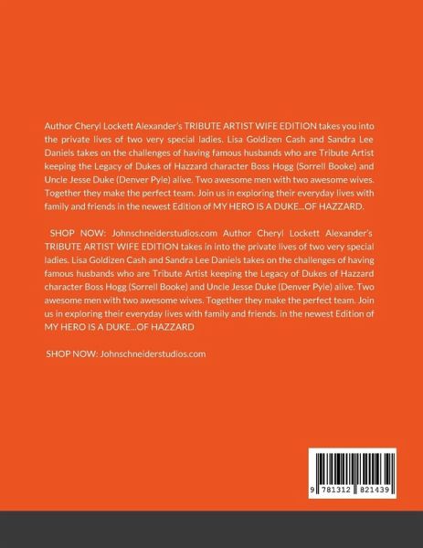 Author Cheryl Lockett Alexander's TRIBUTE ARTIST WIFE EDITION takes you into the private lives of two very special ladies. Lisa Goldizen Cash and Sandra Lee Daniels takes on the challenges of having famous husbands who are Tribute Artist keeping the Legacy of Dukes of Hazzard character Boss Hogg (Sorrell Booke) and Uncle Jesse Duke (Denver Pyle) alive. Two awesome men with two awesome wives. Together they make the perfect team. Join us in exploring their everyday lives with family and friends in the newest Edition of MY HERO IS A DUKE...OF HAZZARD SHOP NOW: Johnschneiderstudios.com
