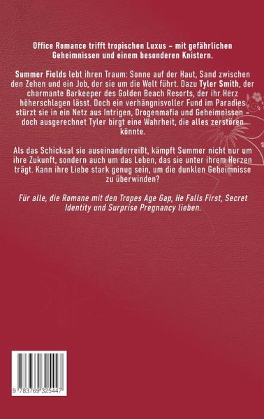 Office Romance trifft tropischen Luxus mit gefährlichen Geheimnissen und einem besonderen Knistern. Summer Fields lebt ihren Traum: Sonne auf der Haut, Sand zwischen den Zehen und ein Job, der sie um die Welt führt. Dazu Tylor Smith, der charmante Barkeeper des Golden Beach Resorts, der ihr Herz höherschlagen lässt. Doch ein verhängnisvoller Fund im Paradies stürzt sie in ein Netz aus Intrigen, Drogenmafia und Geheimnissen und ausgerechnet Tylor birgt eine Wahrheit, die alles zerstören könnte. Als das Schicksal sie auseinanderreißt, kämpft Summer nicht nur um ihre Zukunft, sondern auch um das Leben, das sie unter ihrem Herzen trägt. Kann ihre Liebe stark genug sein, um die dunklen Geheimnisse zu überwinden? Für alle, die Romane mit den Tropes Age Gap, He Falls First, Secret Identity und Surprise Pregnancy lieben.