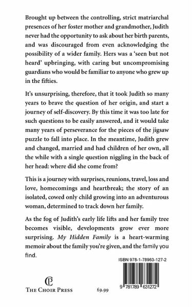 Brought up between the controlling, strict matriarchal presences of her foster mother and grandmother, Judith never had the opportunity to ask about her birth parents, and was discouraged from even acknowledging the possibility of a wider family. Hers was a ‘seen but not heard’ upbringing, with loving but uncompromising guardians who would be familiar to anyone who grew up in the fifties. It’s unsurprising, therefore, that it took Judith so many years to brave the question of her origin, and start a journey of self-discovery. By this time it was too late for such questions to be easily answered, and it would take many years of perseverance for the pieces of the jigsaw puzzle to fall into place. In the meantime, Judith grew and changed, married and had children of her own, all the while with a single question niggling in the back of her head: where did she come from? This is a journey with surprises, reunions, travel, loss and love, homecomings and heartbreak; the story of an isolated, cowed only child growing into an adventurous woman, determined to track down her family. As the fog of Judith’s early life lifts and her family tree becomes visible, developments grow ever more surprising. My Hidden Family is a heart-warming memoir about the family you’re given, and the family you find.