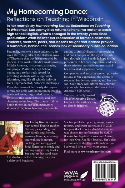 In her memoir My Homecoming Dance: Reflections on Teaching in Wisconsin, Sue Leamy Kies returns to her alma mater to teach high school English. What's changed in the twenty years since graduation? What hasn't? Her recollection of former classmates, students, mentors, peers, and lessons taught and learned provide a humorous, behind-the-scenes look at secondary public education. Platteville, home to a state university, lies amid the rolling hills of the Driftless Area of Wisconsin that was left untouched by glaciers. This work embodies small town Middle America, its customs, attitudes, and people. Platteville High School maintains a stellar track record for providing students with a top-notch education, but, like all schools today, it faces unprecedented, historical challenges. Over the course of her nearly thirty-year career, Sue deals with homecoming pranks, hormonal teens, disgruntled parents, demonstrative administrators, and ever-changing technology. The drama of three bomb threats in one year, mandatory shooter drills, book banning, and ramifications of Act 10 distract from teaching and put a damper on the joy of the job. But, through it all, Sue finds hope for the profession in her ever-inquisitive students, those priceless teachable moments, and her dedicated supportive peers. Compassion and empathy present powerful lessons as Sue experiences the deaths of students, her beloved mentor, and her own son. Sue's story will inform and entertain anyone who has entered the doors of an American high school. You are cordially invited to My Homecoming Dance. Unlike in the author's day, no date is required.
