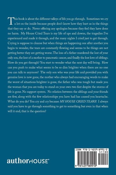 This book is about the different valleys of life you go through. Sometimes we cry a lot on the inside because people don't know how they hurt us in the things that they say or do. Never offering any apologies because they feel they have done no harm. My House Cried Tears is my life of ups and downs, the tragedies I've experienced and made it through, and the many nights I cried just to get through. Crying is suppose to cleanse but when things are happening one after another you begin to wonder, the tears are constantly flowing and seems to be things are not getting better they are getting worse. The loss of a father murdered the lost of your only son, the lost of a mother to pancreatic cancer, and finally the lost love of siblings. How do you get through? You start to wonder what the next day will bring. How can you push to make what seems to be so dim brighter when there are no one you can talk to anymore? The only son who was your life and provided you with genuine love is now gone, the mother who always had encouraging words to make the worst of situations brighter is gone, the father who was tough but made you the woman that you are today to stand on your own two feet despite the storms of life is gone. No support system. No relation between the siblings and your friends are few, along with the few relationships you have had has caused you heartache. What do you do? You cry and cry because MY HOUSE CRIED TEARS! I always said you have to go through something to get to something but even in that when will it end, that is the question?