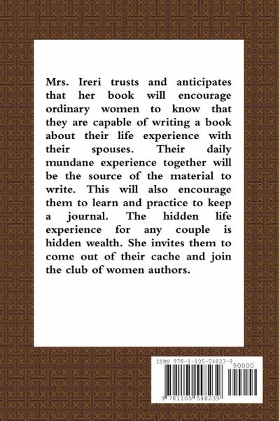 Mrs. Ireri trusts and anticipates that her book will encourage ordinary women to know that they are capable of writing a book about their life experience with their spouses. Their daily mundane experience together will be the source of the material to write. This will also encourage them to learn and practice to keep journal. The hidden life experience for any couple is hidden wealth. She invites them to come out of their cache and join the club of women authors.