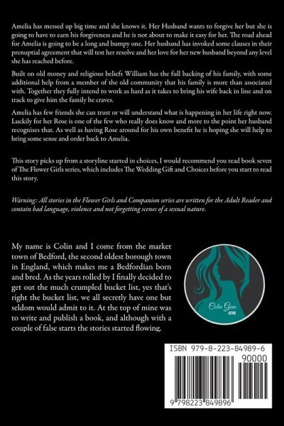 When a Wife is good the world she lives in is a better place. Amelia has messed up big time and she knows it. Her Husband wants to forgive her but she is going to have to earn his forgiveness and he is not about to make it easy for her. The road ahead for Amelia is going to be a long and bumpy one. Her husband has invoked some clauses in their prenuptial agreement that will test her resolve and her love for her new husband beyond any level she has reached before. Built on old money and religious beliefs William has the full backing of his family, with some additional help from a member of the old community that his family is more than associated with. Together they fully intend to work as hard as it takes to bring his wife back in line and on track to give him the family he craves. Amelia has few friends she can trust or will understand what is happening in her life right now. Luckily for her Rose is one of the few who really does know and more to the point her husband recognises that. As well as having Rose around for his own benefit he is hoping she will help to bring some sense and order back to Amelia. This story picks up from a storyline started in choices, I would recommend you read book seven of The Flower Girls series, which includes The Wedding Gift and Choices before you start to read this story. Warning: All stories in the Flower Girls and Companion series are written for the Adult Reader and contain bad language, violence and not forgetting scenes of a sexual nature. ¿¿¿