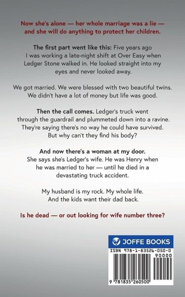 Is he dead - or out looking for wife number three? The first part went like this: Five years ago I was working a late-night shift at Over Easy when Ledger Stone walked in. He looked straight into my eyes and never looked away. We got married. We were blessed with two beautiful twins. We didn't have a lot of money but life was good. Then the call comes. Ledger's truck went through the guardrail and plummeted down into a ravine. They're saying there's no way he could have survived. But why can't they find his body? And now there's a woman at my door. She says she's Ledger's wife. He was Henry when he was married to her - until he died in a devastating truck accident. My husband is my rock. My whole life. And the kids want their dad back. Perfect for fans of Freida McFadden, Jeneva Rose, Colleen Hoover and Keri Beevis. Please note this is a revised edition of The Wife Lie.