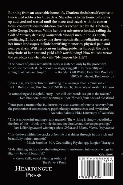 My Impossible Life: Trauma, Travel & Transcendence Charlene Jones Breaking out of the prison of her past, Charlene follows an enigmatic, contentious Caucasian teacher to the far ends of the planet. In India, Mexico, New Zealand she undertakes extreme meditation retreat, dramatic sensory healing, and unique human mandalas-all intended to help her 'awaken' from the drugs, drink, and all night parties that had comprised her Toronto world. Guided by visions, dreams, and angels, she slowly begins to unravel the history her body holds. She learns to endure the harsh emotions rising from the seemingly endless pain held in her muscles. She discovers that every release, no matter how small, brings a moment of relief, a touch of peace, from the relentless raging attacks from her mind. Will Charlene's quest for healing help her find full peace in her heart? In this powerful memoir that follows her travels through Mexico, Australia, New Zealand, and Norway, Charlene shares an intimate narrative of her high-stakes adventures searching for recovery through meditation, holistic strategies, and mystic experiences. And for those tormented by personal tragedy, this brave woman's ability to finally face her memories and release their hold over her will give hope that the human spirit can always triumph. My Impossible Life: Trauma, Travel & Transcendence is an inspirational exploration of never giving up, no matter how hard. If you like relatable people, luminous prose, and the intersection of Eastern and Western thought, then you'll love Charlene Jones's moving revelation. Buy My Impossible Life to shake off the chains of pain today!