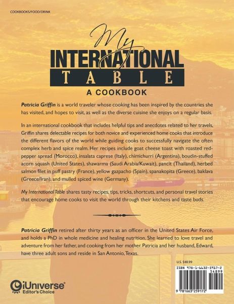 Patricia Griffin is a world traveler whose cooking has been inspired by the countries she has visited, and hopes to visit, as well as the diverse cuisine she enjoys on a regular basis. In an international cookbook that includes helpful tips and anecdotes related to her travels, Griffin shares delectable recipes for both novice and experienced home cooks that introduce the different flavors of the world while guiding cooks to successfully navigate the often complex herb and spice realm. Her recipes include goat cheese toast with roasted red pepper spread (Morocco), insalata caprese (Italy), chimichurri (Argentina), boudin-stuffed acorn squash (United States), shawarma (Saudi Arabia/Kuwait), pancit (Thailand), herbed salmon filet in puff pastry (France), yellow gazpacho (Spain), spanakopita (Greece), baklava (Greece/Iran), and mulled spiced wine (Germany). My International Table shares tasty recipes, tips, tricks, shortcuts, and personal travel stories that encourage home cooks to visit the world through their kitchens and taste buds.