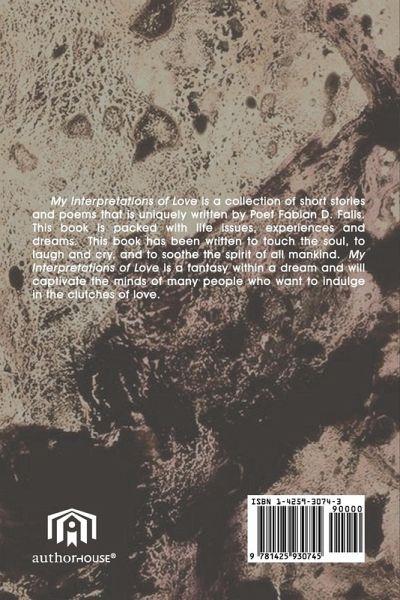 My Interpretations of Love is a collection of short stories and poems that is uniquely written by Poet Fabian D. Falls. This book is packed with life issues, experiences and dreams. This book has been written to touch the soul, to laugh and cry, and to soothe the spirit of all mankind. My Interpretations of Love is a fantasy within a dream and will captivate the minds of many people who want to indulge in the clutches of love.