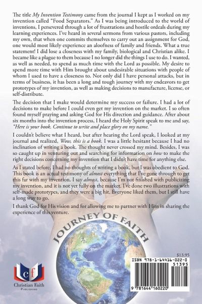 The title My Invention Testimony came from the journal I kept as I worked on my invention called "Food Separators." As I was being introduced to the world of inventions, I persevered through a lot of frustrations and hostile ordeals during my learning experiences. I've heard in several sermons from various pastors, including my own, that when one commits themselves to carry out an assignment for God, one would most likely experience an aloofness of family and friends. What a true statement! I did lose a closeness with my family, biological and Christian alike. I became like a plague to them because I no longer did the things I use to do. I wanted, as well as needed, to spend as much time with the Lord as possible. My desire to spend more time with Him brought about undesirable situations with people of whom I used to have a closeness to. Not only did I have personal attacks, but in terms of business, it has been a long and tough journey with my endeavors to get prototypes of my invention, as well as making decisions to manufacture, license, or self-distribute. The decision that I make would determine my success or failure. I had a lot of decisions to make before I could even get my invention on the market. I so often found myself praying and asking God for His direction and guidance. After about six months into the invention process, I heard the Holy Spirit speak to me and say, "Here is your book. Continue to write and place glory on my name." I couldn't believe what I heard, but after hearing the Lord speak, I looked at my journal and realized, Wow, this is a book. I was a little hesitant because I had no inclination of writing a book. The thought never crossed my mind. Besides, I was so caught up in venturing out and searching for information on how to make the right decisions concerning my invention that I didn't have time for anything else. As I stated before, I had no thoughts of writing a book, but I was obedient to God. This book is an actual testimony of almost everything that I've gone through to get this far with my invention. I say almost, because I'm not finished with publicizing my invention, and it is not yet fully on the market. I've done two illustrations with self-made prototypes, and they were a big hit. Everyone liked them, but I still have a long way to go. I thank God for His vision and for allowing me to partner with Him in sharing the experience of this venture.